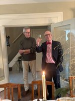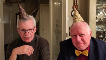 Helaas moesten we onze vaste kok Joep vanwege ziekte missen, maar gelukkig is dit ruimschoots opgevangen door niet te versmaden gerechten van andere clubleden: Annelies’ garnalencocktail met extra veel Whiskysaus, Jonel’s Bolognese uit de van haar dochter geleende - indrukwekkende - XL-pan van Le Creuset, vergezeld van Angela’s kleurrijke salade die wel een Mediterraan schilderij leek. Daarbij dronken we een voortreffelijke witte wijn die door Ton, in ruime hoeveelheid, was meegenomen. Dan koffie & thee met Rolfs familieverpakking Leonidas-bonbons, waar men meermalen uit kon smullen. En als verrassing nog eens twee taarten van Pauline die er als koek in gingen; wat een verwennerij allemaal! ‘Morgen’ zouden onze goede voornemens ingaan.