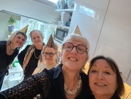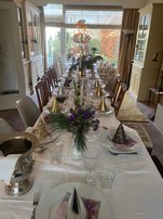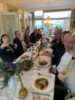 Zoals gebruikelijk was onze club voor de traditionele Nieuwjaarslunch uitgenodigd bij voorzitter Jonel. De lange tafel onder de kroonluchter was weer bijzonder feestelijk gedekt, ditmaal voor 17 personen. Damasten tafelkleed, bloemen op tafel en op de servetten, brandende kaarsen, champagne om met elkaar op een gelukkig 2026 te toosten.
